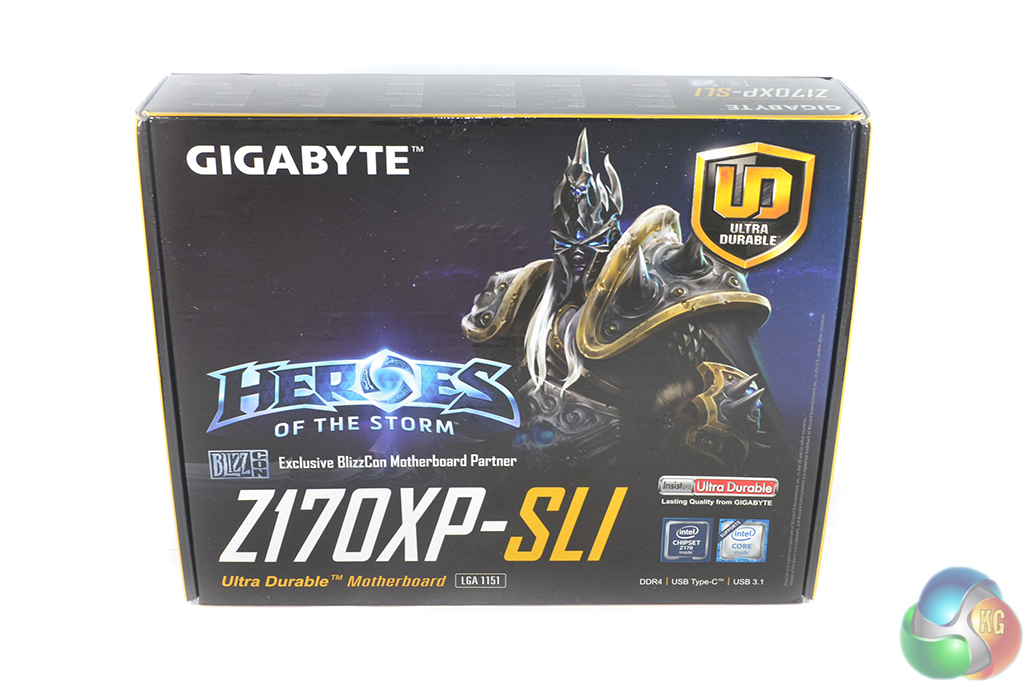 The front of the motherboard's packaging shouts out the product name and also features Heroes of the Storm game branding.