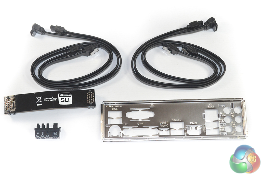 Gigabyte includes four SATA cables, which is great to see. Completing the bundle are a basic rear IO shield, a black SLI ribbon, and Gigabyte's G-connector device for easily connecting front panel cables.