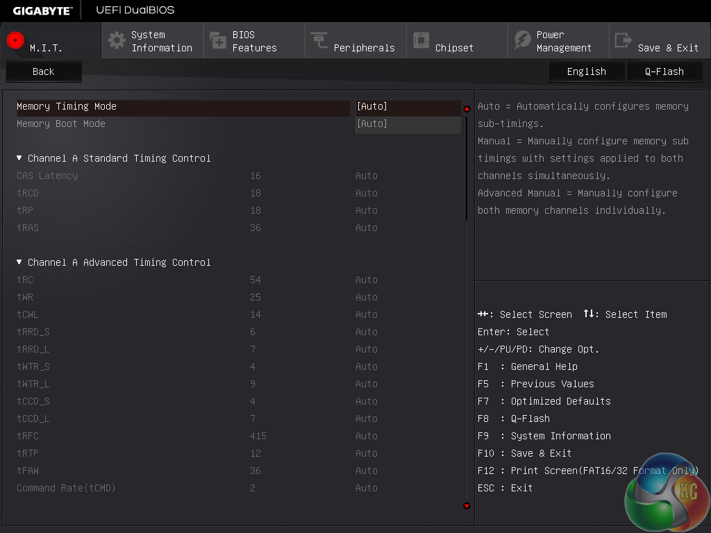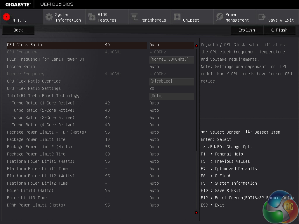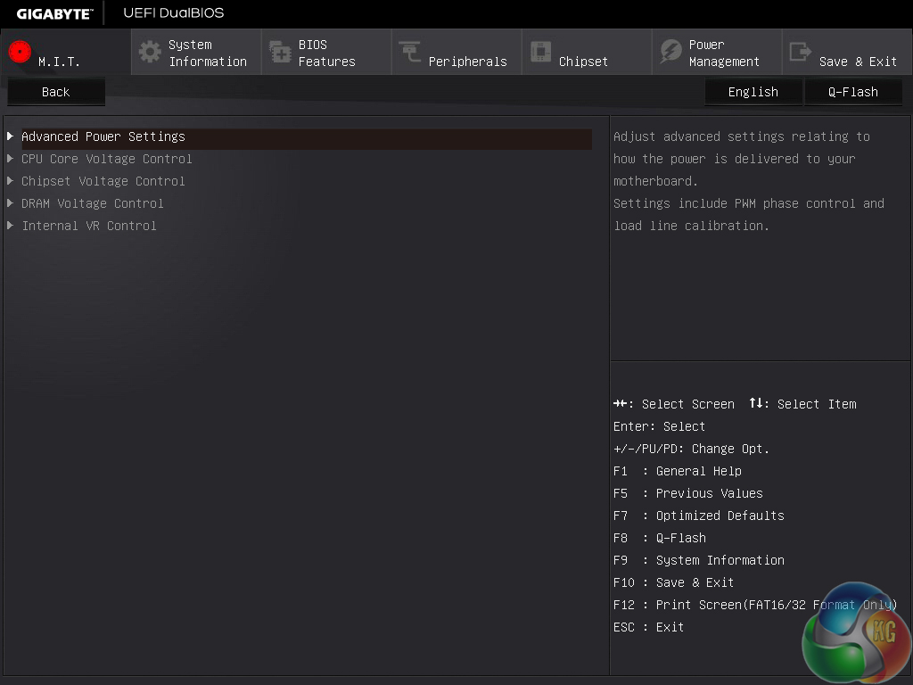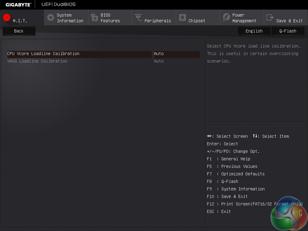 A select few power and voltage settings are provided throughout the UEFI. I was not impressed by Gigabyte's chosen input method for some of the selections. CPU VCore Loadline Calibration, for example, was given only two selections which were toggled using the – and + keys, rather than a drop-down list.