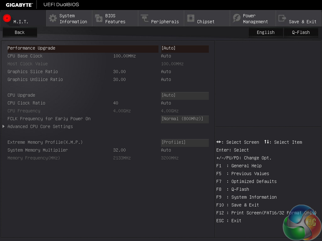 Entry point for Gigabyte's Z170 UEFI is the M.I.T page. This is the point where the main system operating functions, such as voltages, clock speeds, and fan controls, can be accessed.