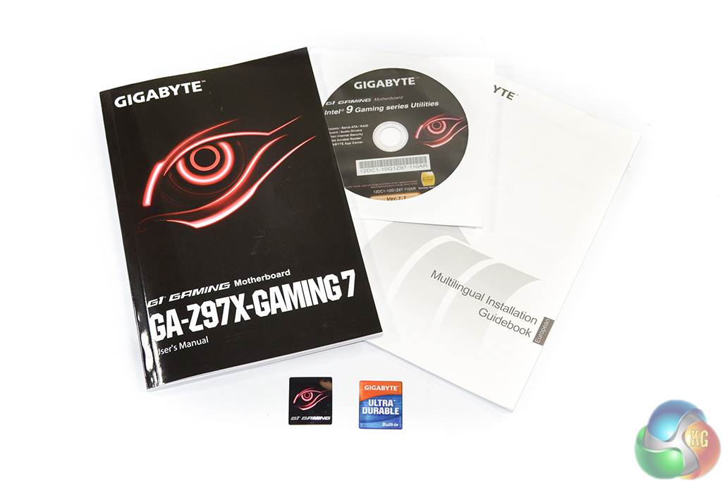 Gigabyte includes a comprehensive manual, an installation guide, a driver CD, and two case stickers.
