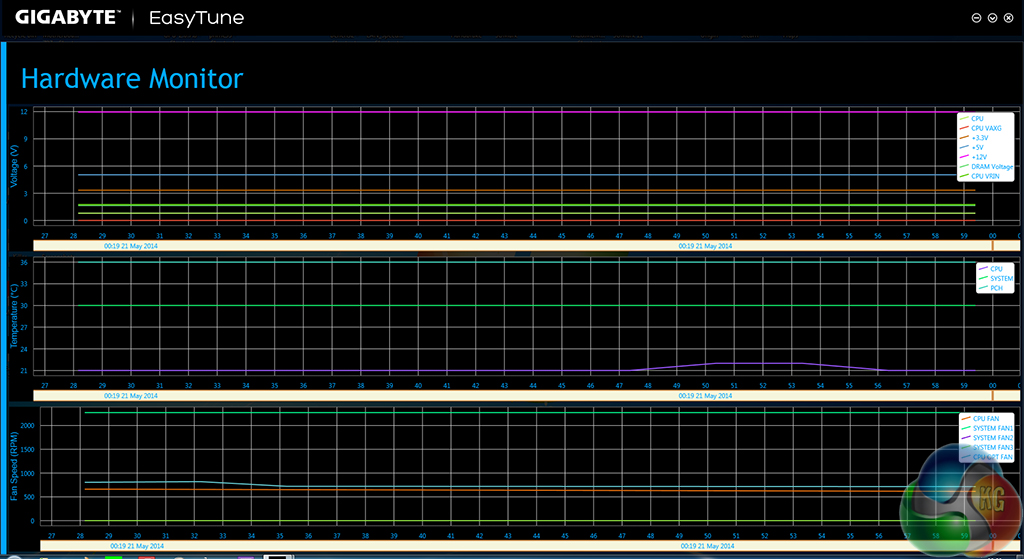 The monitoring section displays voltage, fan speed, and temperature readings, although the graphs are very ugly and poor layout makes them difficult to read. We also noticed that Gigabyte's CPU temperature reading is erroneous; a sub-ambient temperature was recorded, indicating a clear issue.