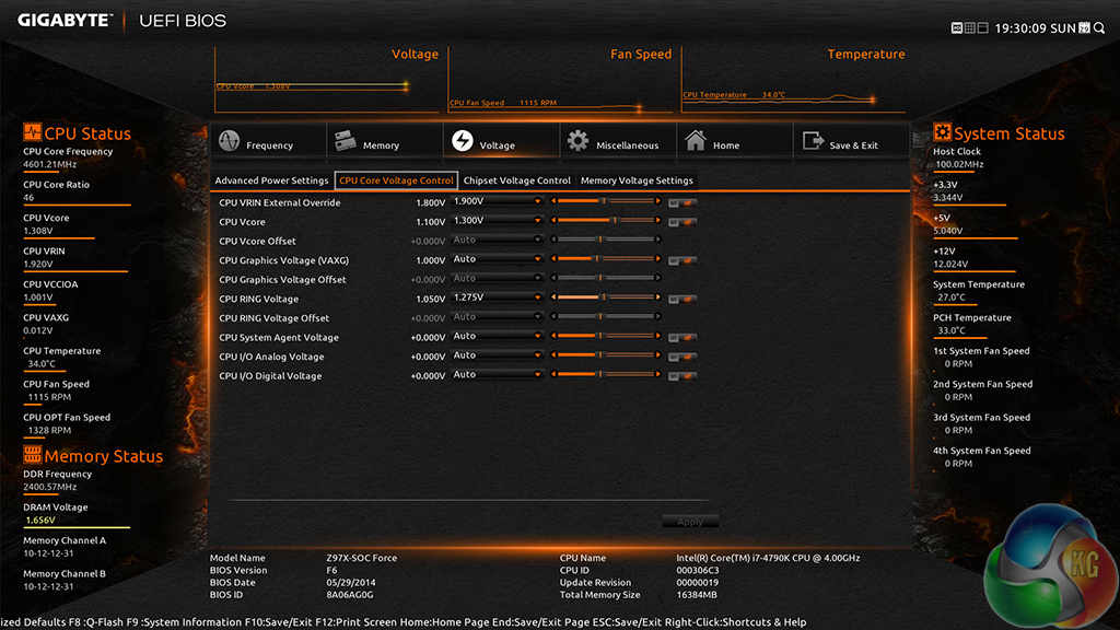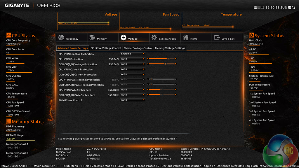 To test the Gigabyte Z97X-SOC Force motherboard’s CPU overclocking potential, we first increased the CPU VCore to 1.30V, Cache voltage to 1.275V, CPU Input Voltage to 1.900V, and PCH voltage to 1.10V. ‘Extreme' load-line calibration was applied. The Uncore ratio was maintained at 40x.