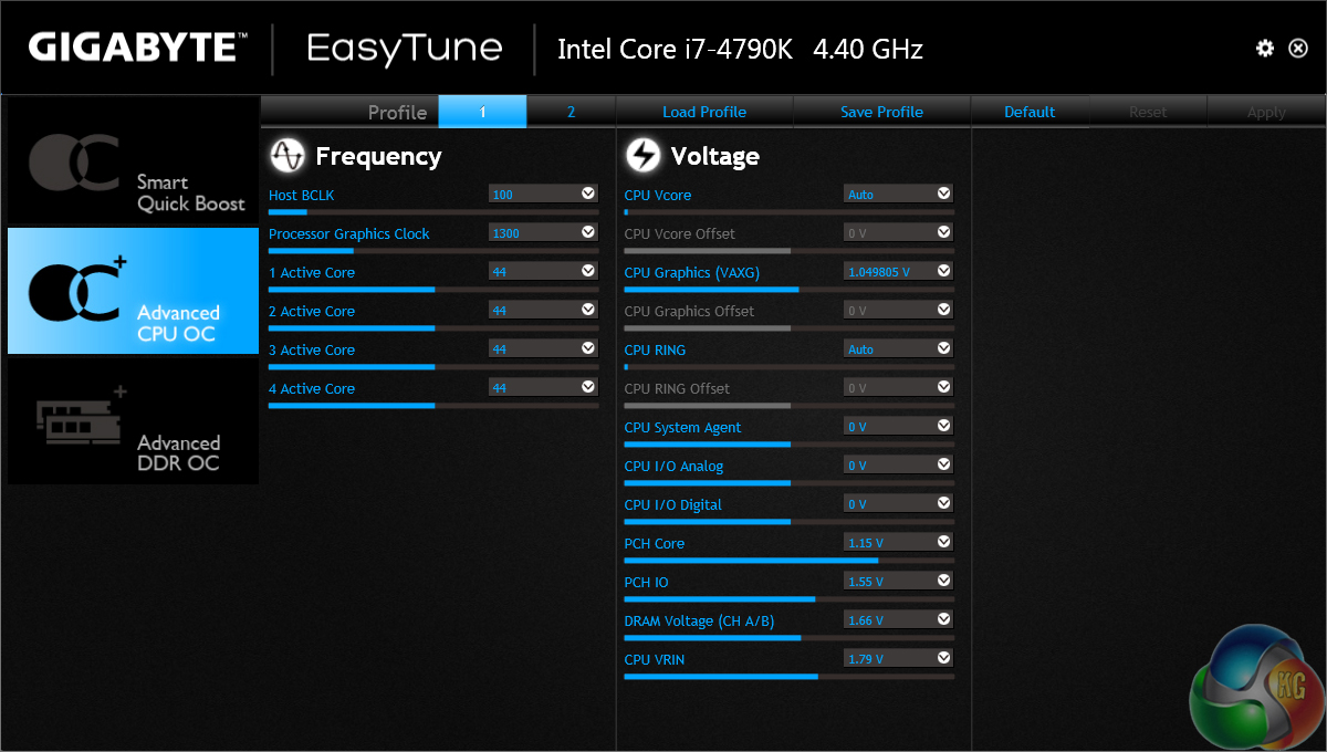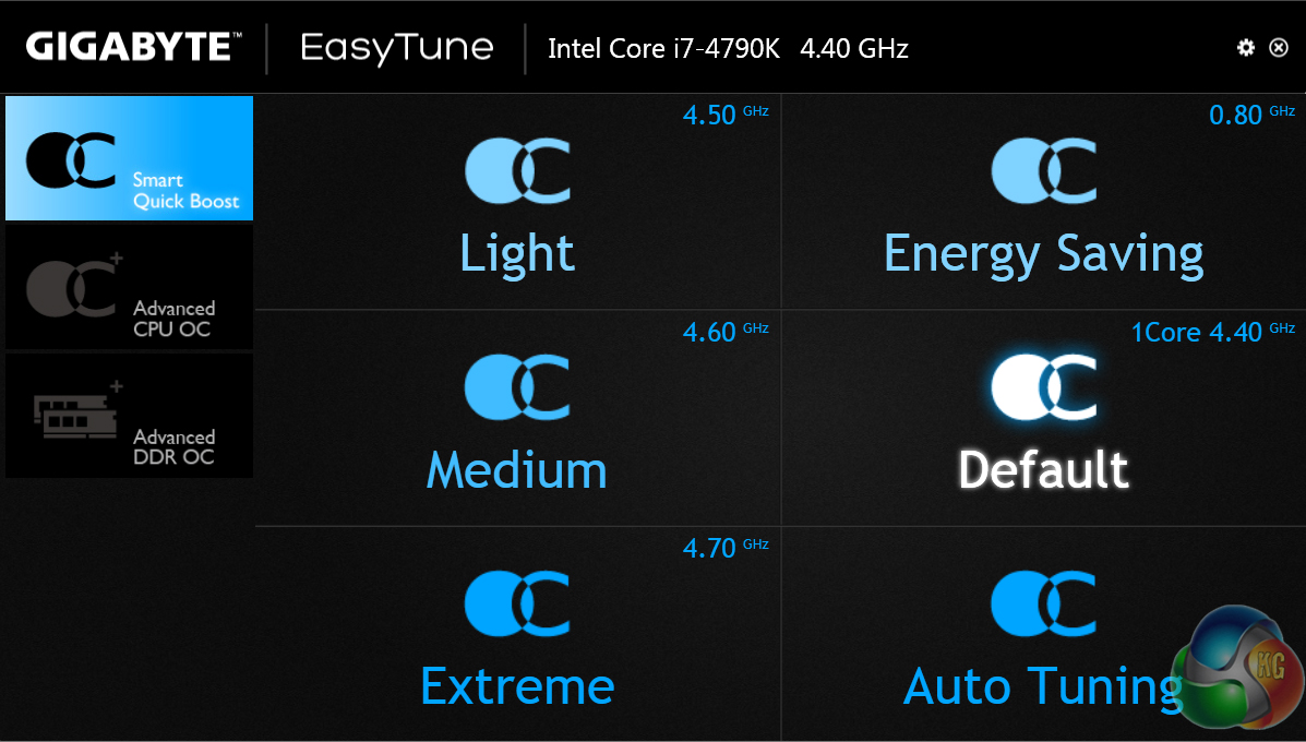 Gigabyte's EasyTune software allows users to view and adjust frequency, voltage, and other overclocking-related settings in an OS environment. Pre-set frequency profiles can also be selected.