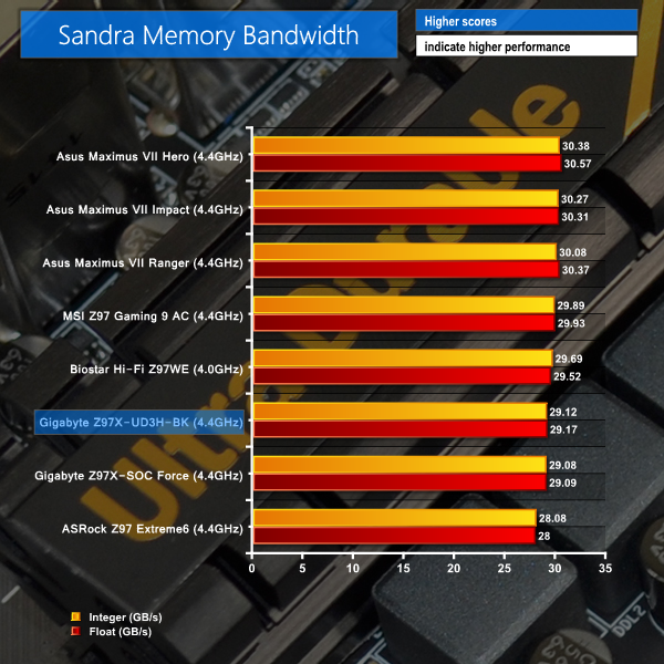 Gigabyte's Z97X-UD3H-BK shows positive performance in our batch of system-related benchmarks. The 3DMark Physics score is positive, and Sandra's Processor Arithmetic result puts the board in the top pair of contenders.