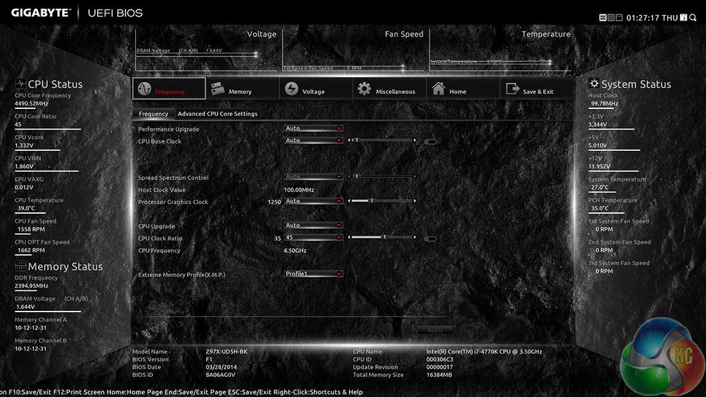 For hitting 4.5GHz, we didn’t have to mess around with offset voltages or any other irritating settings; the Z97X-UD5H-BK was happy to take our inputs and return a 4.50GHz overclock.