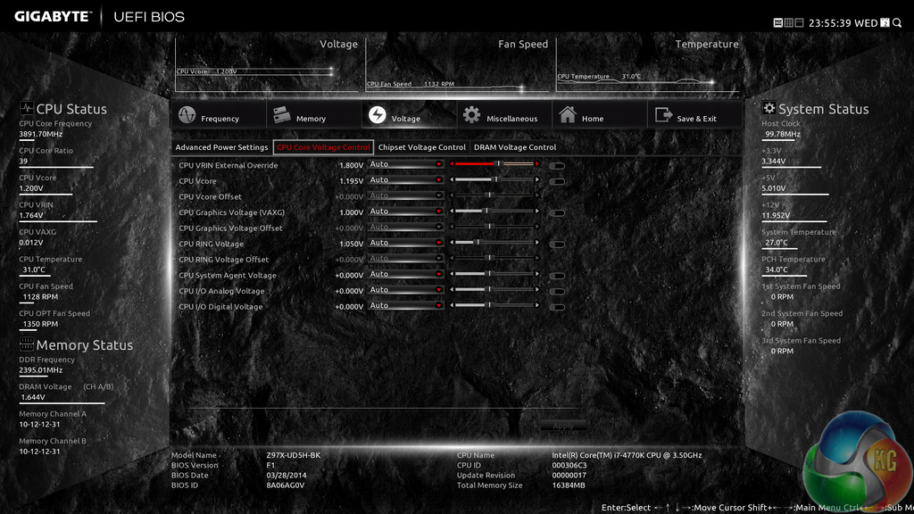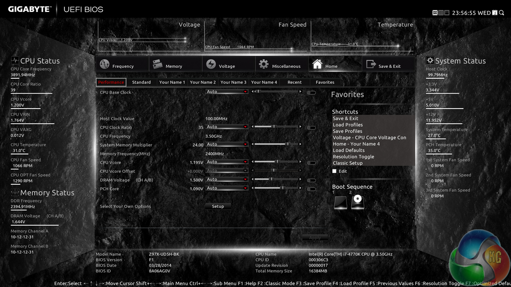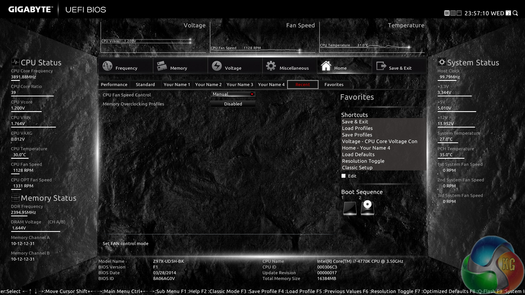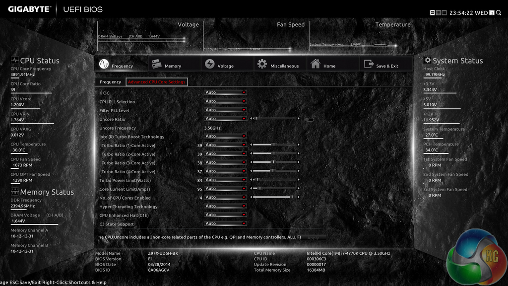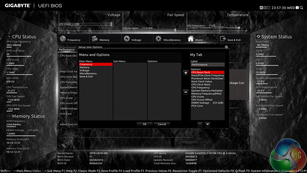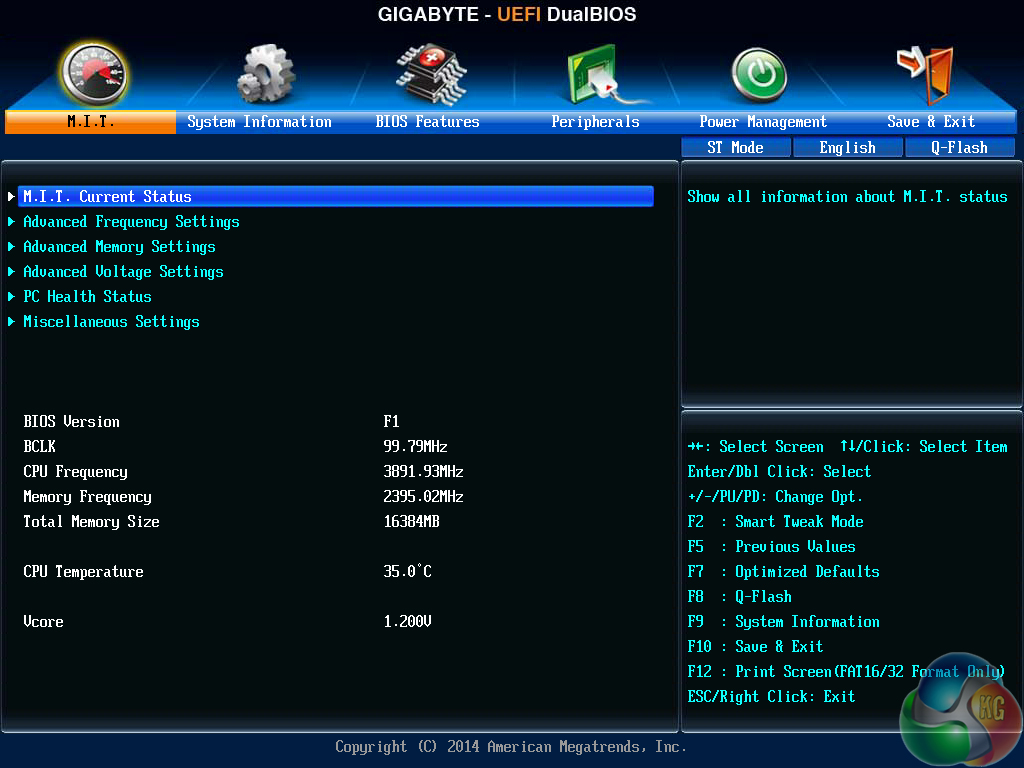 Upon entering the 1920 x 1080 (dependent upon your monitor's resolution) UEFI, Gigabyte opens the frequency page. The interface packs large amounts of information into a single screen by virtue of its 1920 x 1080 resolution. Voltages, frequencies and other monitoring parameters are consistently scattered around the outside of each page.