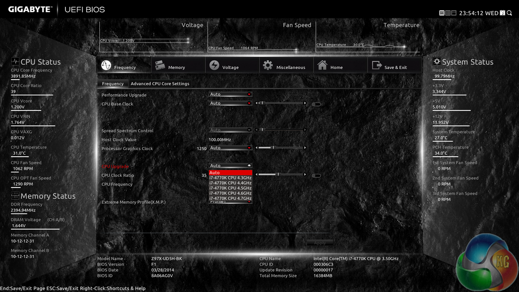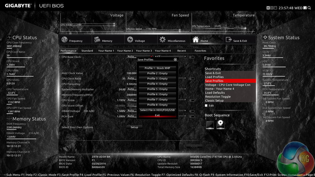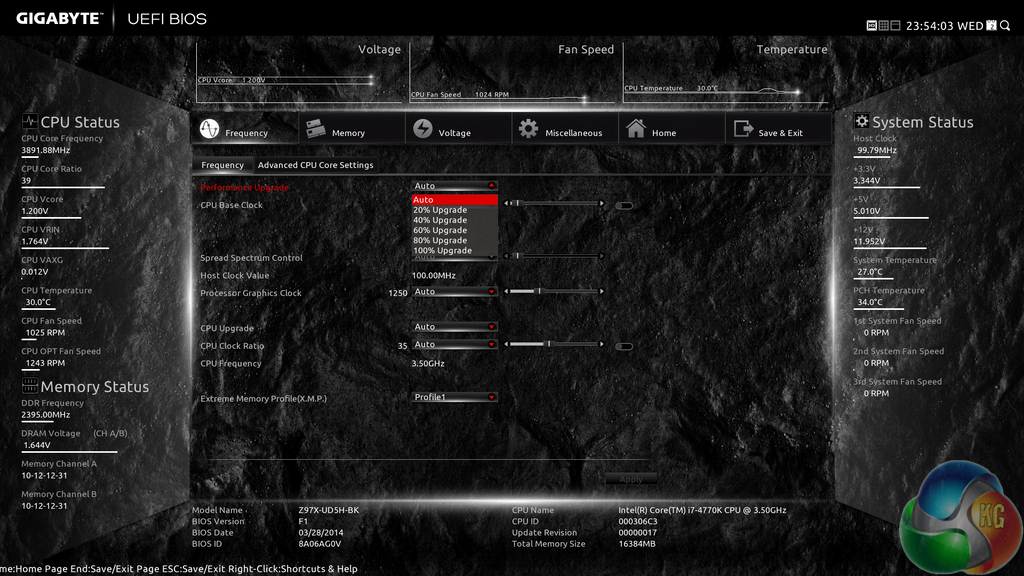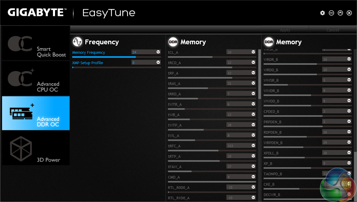 Frequency and timings configurations can be adjusted via the Memory section. Gigabyte includes pre-set profiles tailored for high-spec RAM kits by overclocking professionals such as HiCookie.
