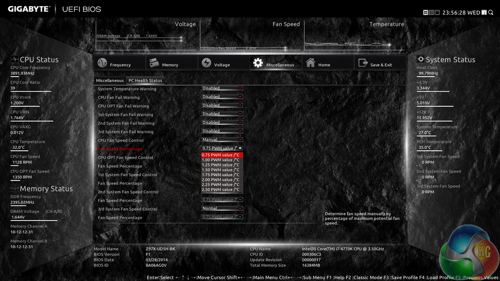 Fan and warning settings can be accessed via the PC Health Status column of the Miscellaneous section. Fan speed controls can be set to a user's preference, albeit with a limited range of input.