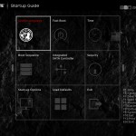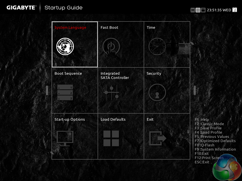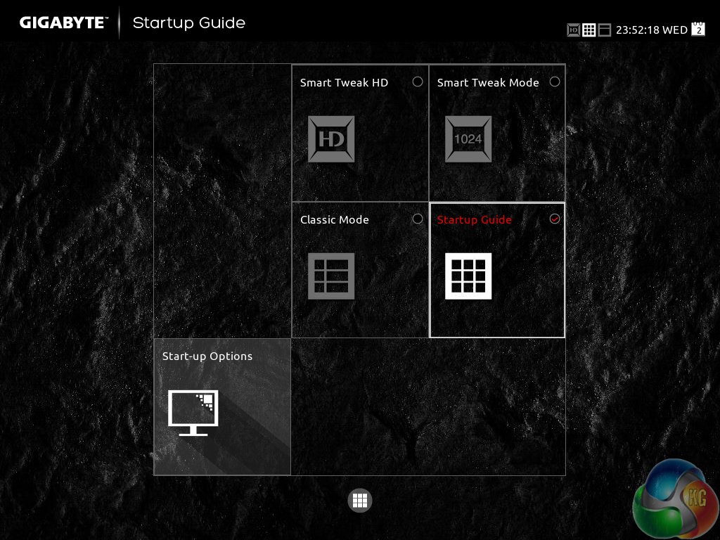 Gigabyte greets users with an entry page that resembles the Windows Metro UI. Tiles provide users with quick access to certain features and settings.