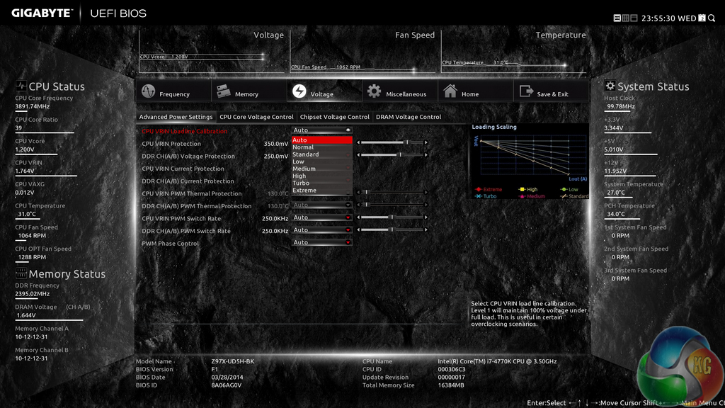 Power and voltage settings can be adjusted in the relevant subsection. Some of the parameters, such as CPU VRIN Loadline Calibration, open a graphical display to assist a user in making an appropriate choice.