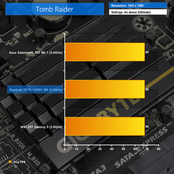 Gigabyte's Z97X-UD5H-BK shows performance equivalent to competing products from MSI and Asus in our Tomb Raider and Bioshock Infinite tests.