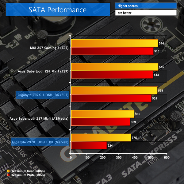 The Z97 SATA 6Gbps connections act as we would expect them to; the speed of a SATA 6Gbps SSD, such as the Kingston HyperX 3K, will not be limited by the chipset-based links.