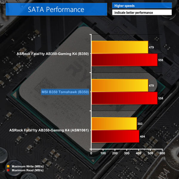 Performance from the AMD-based SATA 6Gbps ports is right where it should be. MSI does not equip the B350 Tomahawk with an add-on SATA controller to increase its onboard port count.