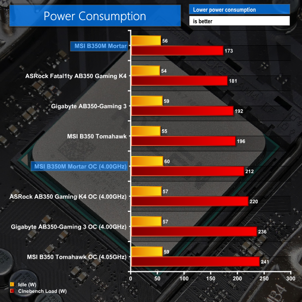 In both the stock and overclocked configurations, MSI's micro-ATX Mortar used less load power than the competitors it is charted against.