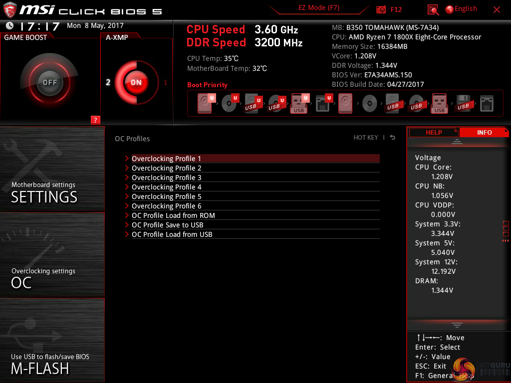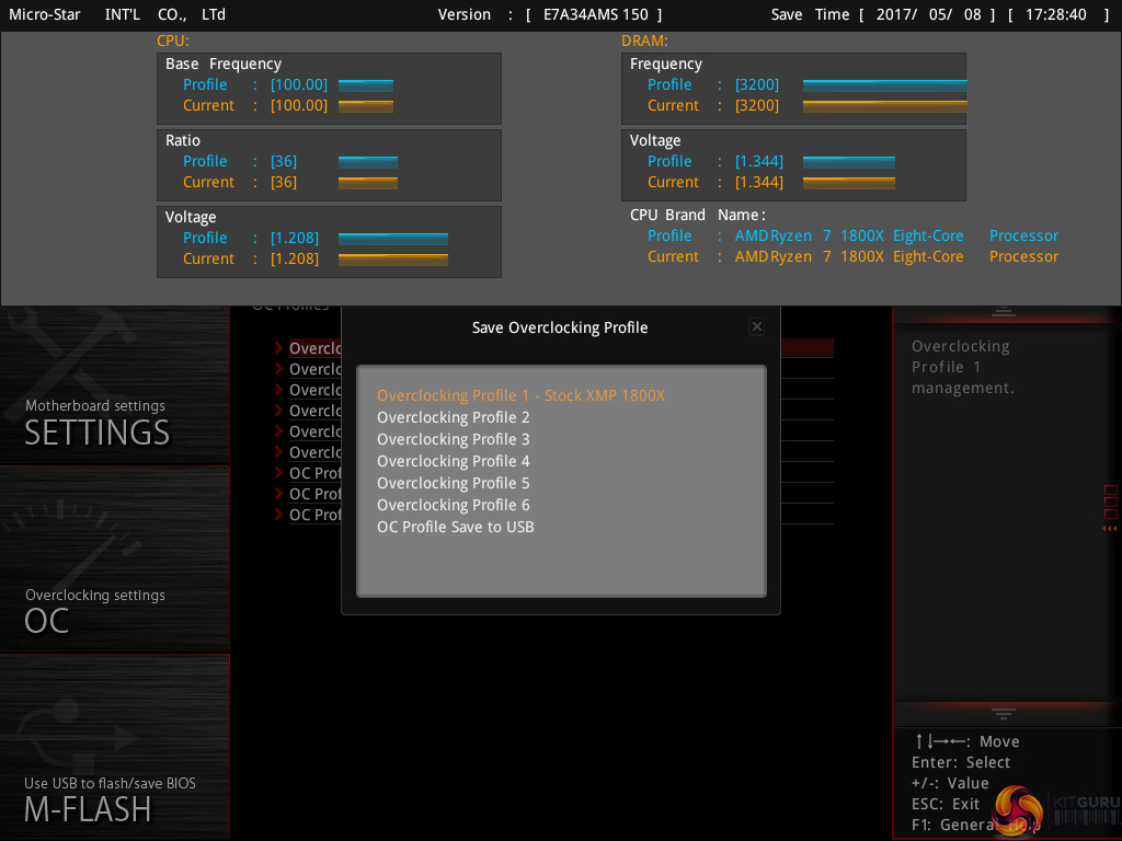 Up to six individual settings profiles can be saved to the board and more can be transferred using storage mediums. Pressing F8 and F9 on a main page of the UEFI draws down an overclocking profile tool which allows for saving and loading.