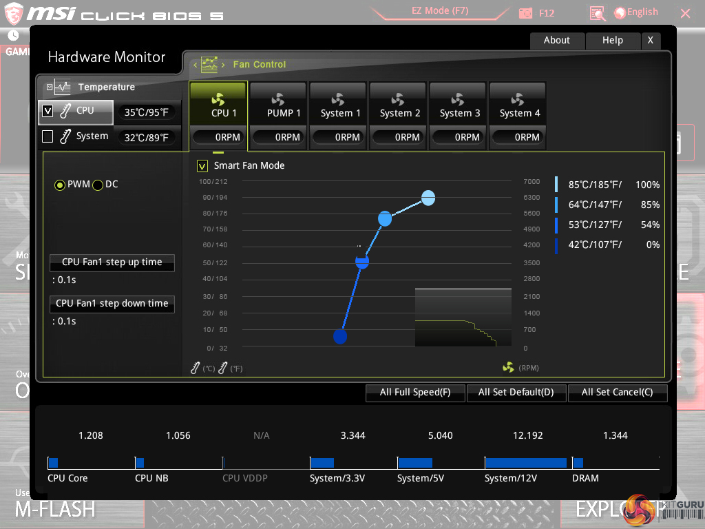 Hardware Monitor is where the primary fan control actions take place. PWM and DC control modes are selectable. MSI keeps in-built fan speed presets to a bare minimum and instead relies on its good graphical control method.
