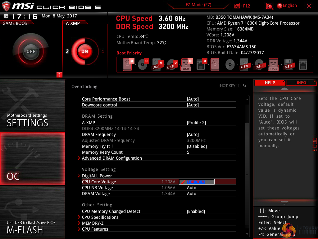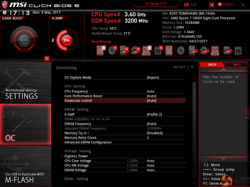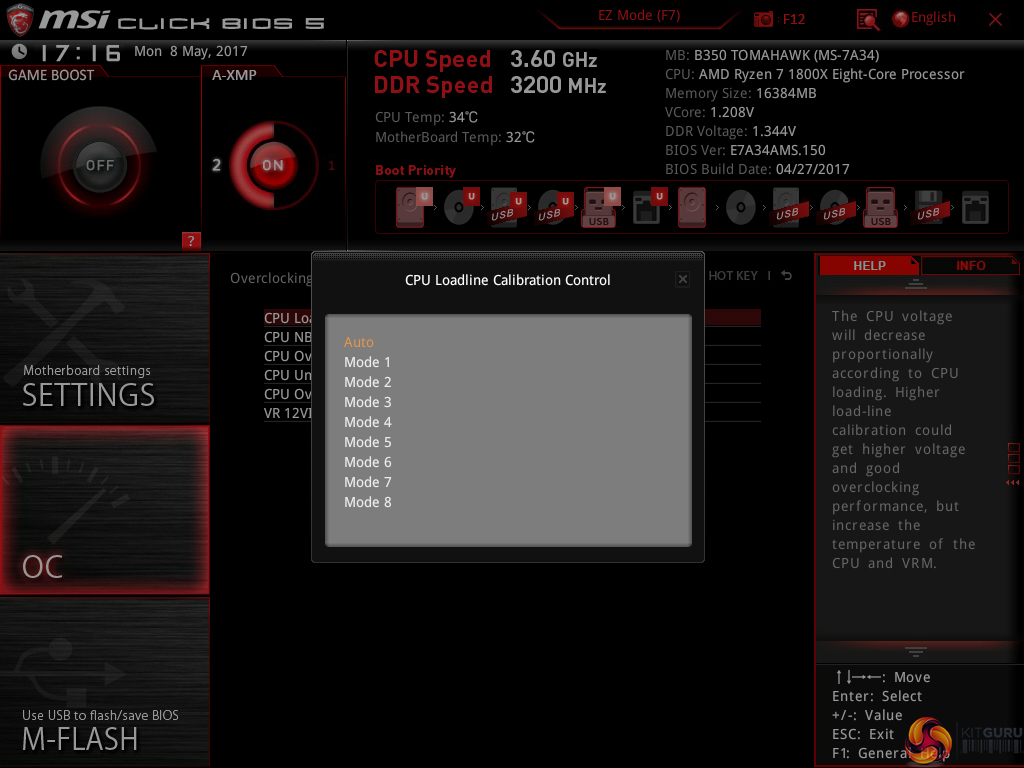 Unlike the X370 alternatives, MSI’s load-line calibration (LLC) settings for B350 are unclear. Nine different options can be selected but MSI chooses not to deploy its simple graph to show how the voltage changes based on load. The graph would have aided the simplicity of our overclocking attempts but instead we had to resort to a trial and error approach.