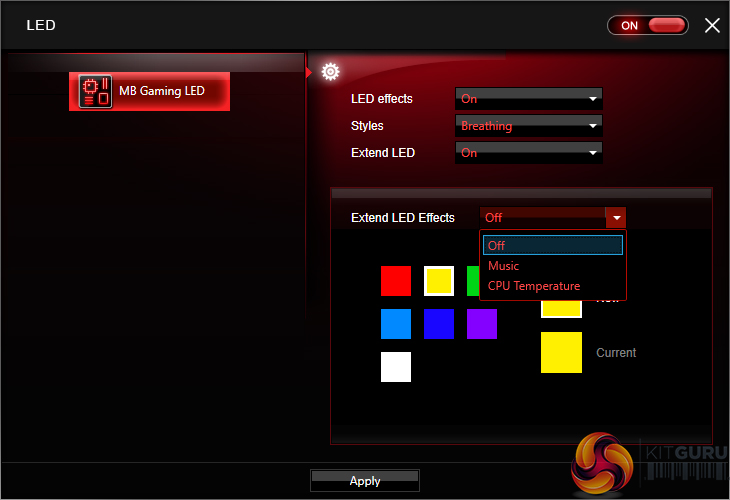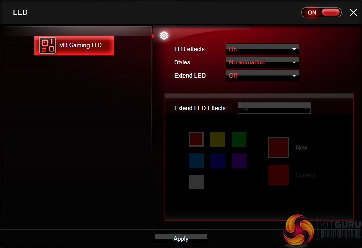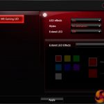 The LED section of MSI’s Gaming App is where most users are likely to be spending their time. Individual control is given to the lighting section of the motherboard and the 4-pin RGB header. There is also an option to completely switch off all LED lighting.