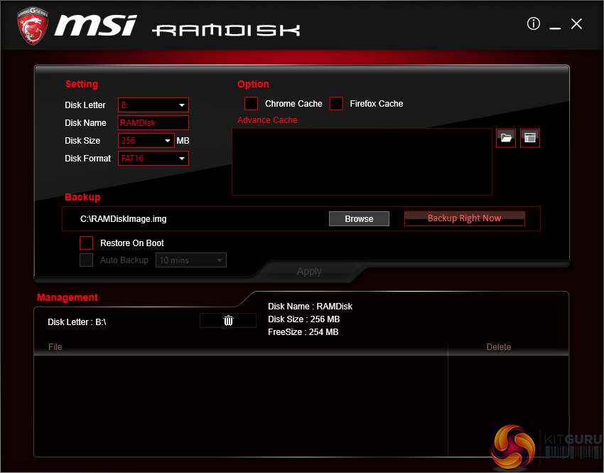 MSI’s RAMdisk does what the title says. The RAM disk size can be set up to a high percentage of system memory. The tool also includes options to restore the RAM disk upon boot, back it up to a non-volatile storage device, and set advanced cache for certain options.