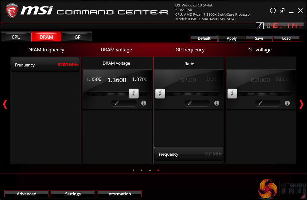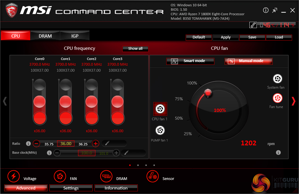 Break-out tabs display information and adjustment options for voltages, ratios, and fan speeds. DRAM timings also get their own break-out page.