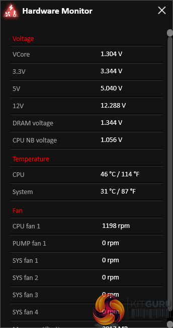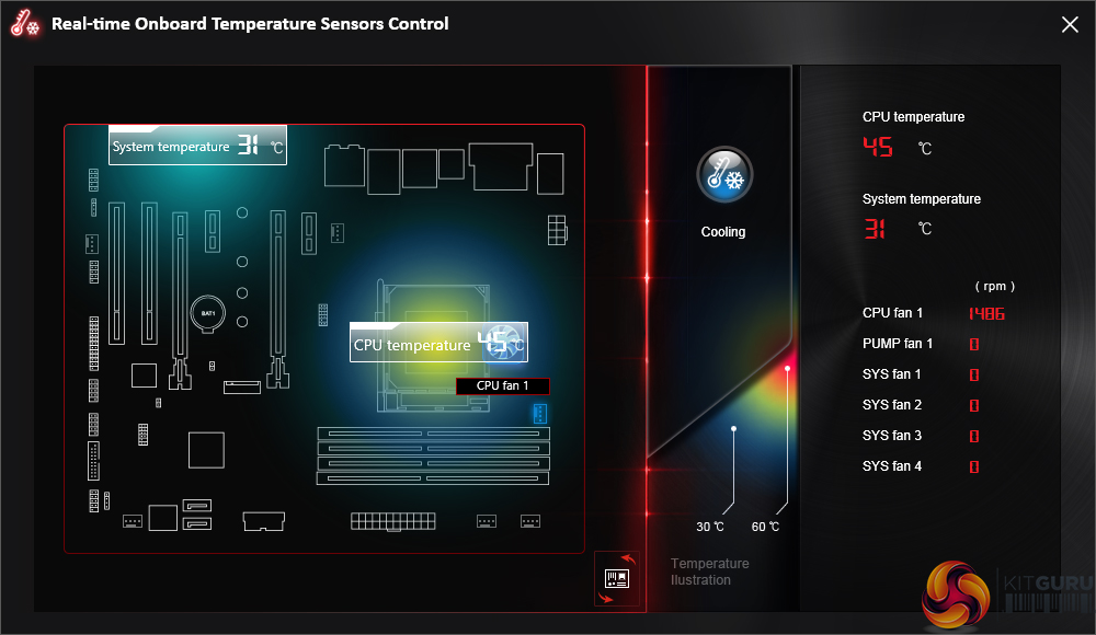 MSI’s temperature sensor page is good although the number of reading points is limited. This page also shows which fans are connected and a temperature illustration can be set to give visual interpretation of system behaviour.