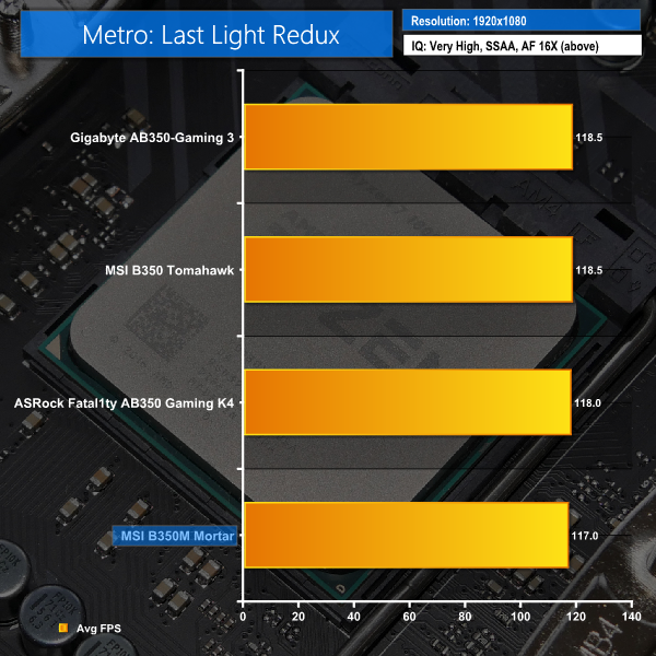 Gaming performance for the B350M Mortar is fine. A recent update to Ashes of the Singularity Escalation delivers flattering results for MSI (and Gigabyte) while Metro turns in a little slower than the competition but not by a worrying margin.