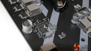 Another minor design point that is good to see if the use of a thermal pad to contact the chokes. Realistically, the chokes do not need to be cooled by the VRM heatsink. But there is no harm in connecting them with the large blocks of metal to provide some additional cooling capacity, if required.