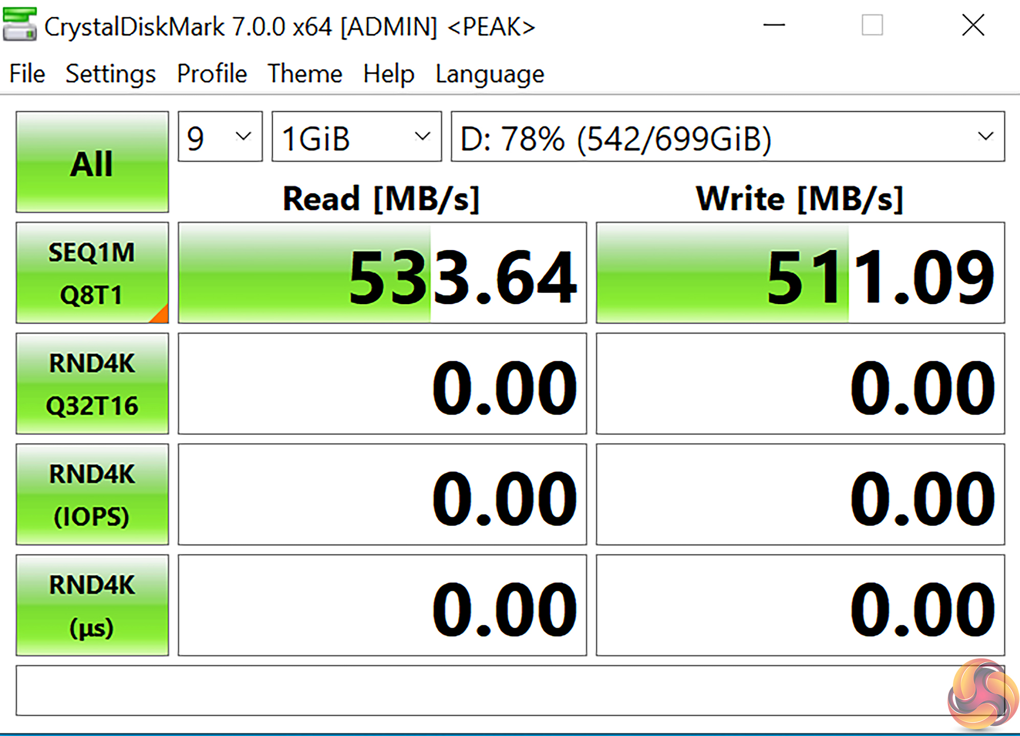 M.2 performance is at the level we expect, with the read result coming in at just below 5GBps. Of course, any M.2 SSD installed in the chipset-connected slot will be limited to PCIe Gen 3 x4 bandwidth and any CPU-to-chipset link speed restrictions.