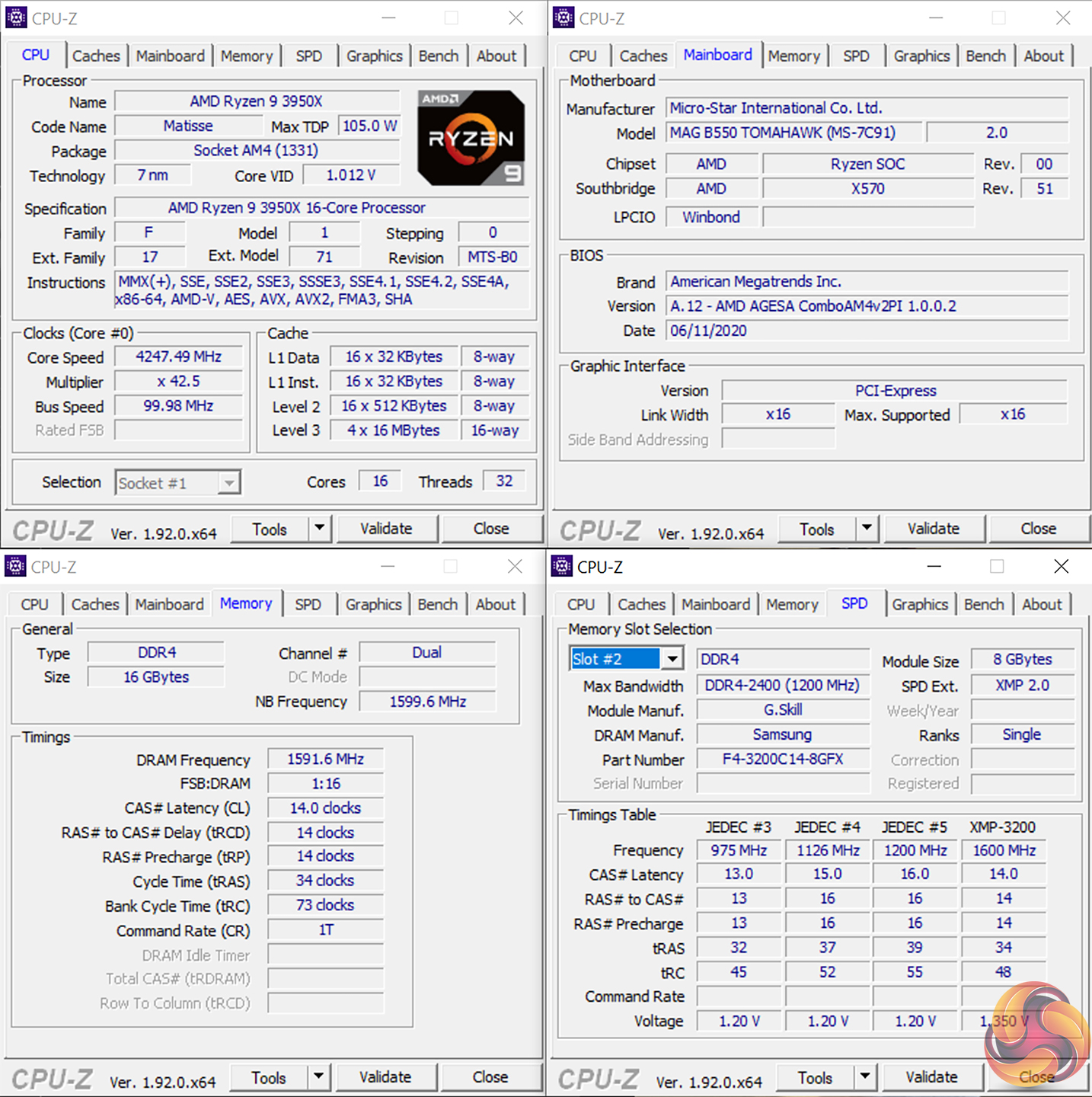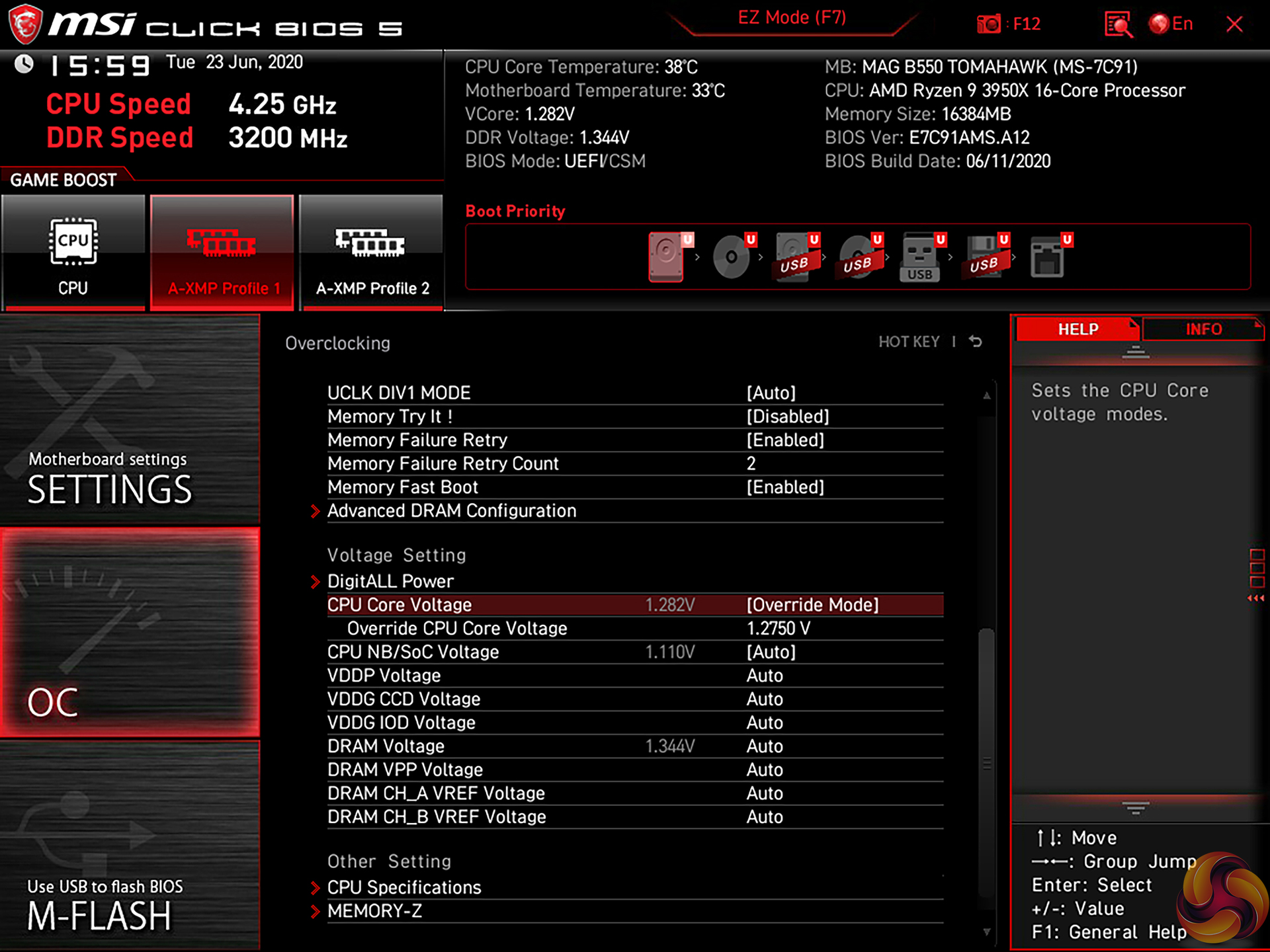The usual 4.25GHz overclock of our Ryzen 9 3950X 16-core CPU was achieved. Typically, we opt for 1.3V but the MSI motherboard was better set with 1.275V and Mode 3 LLC. This delivered around 1.26V under heavy load – a similar level to the competing B550 offerings.