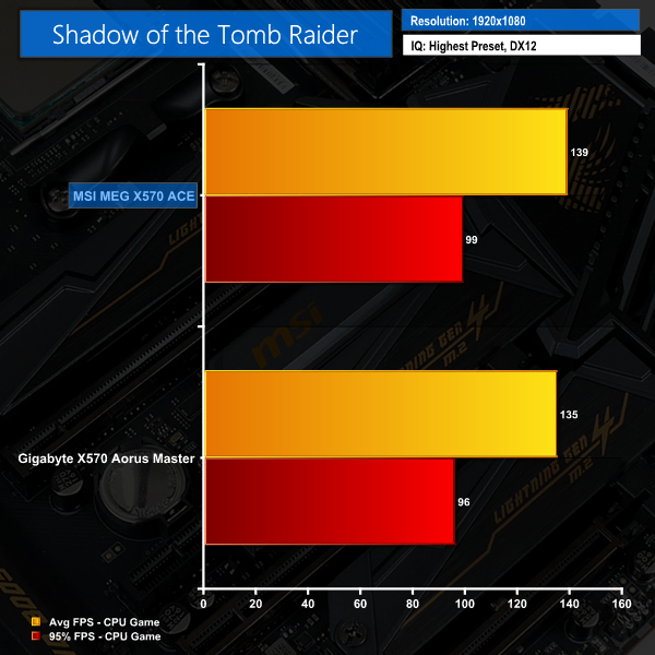 The X570 ACE also shows strong performance in Deux Ex, managing to beat out the Gigabyte X570 Aorus Master by 1 FPS on average and 2 FPS on the minimum. Shadow of the Tomb Raider registers another victory for the MSI board, this time with a 4 FPS advantage on average and 3 FPS on the minimum.