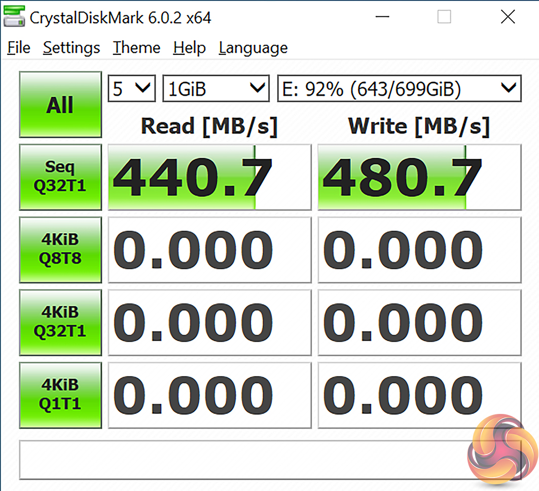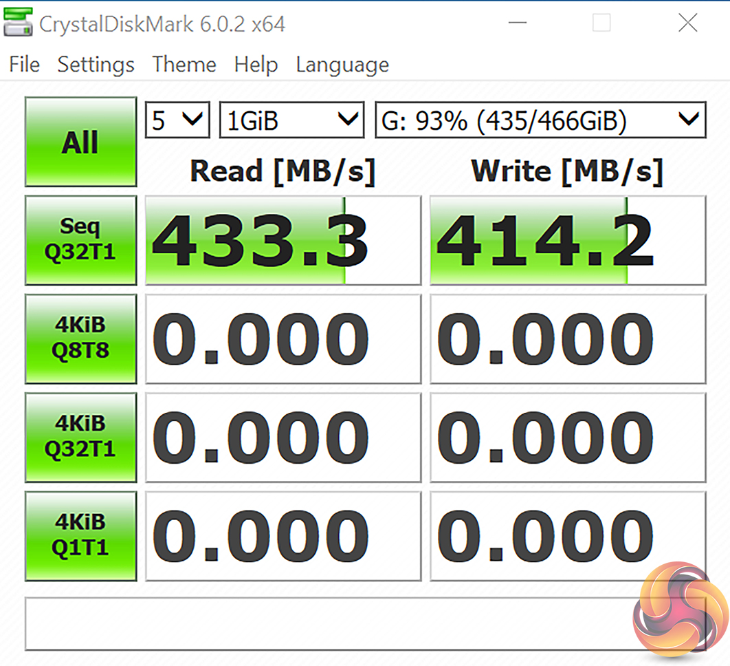 USB 3.0 5Gbps performs as expected, also, with sequential speeds just above 400MBps.