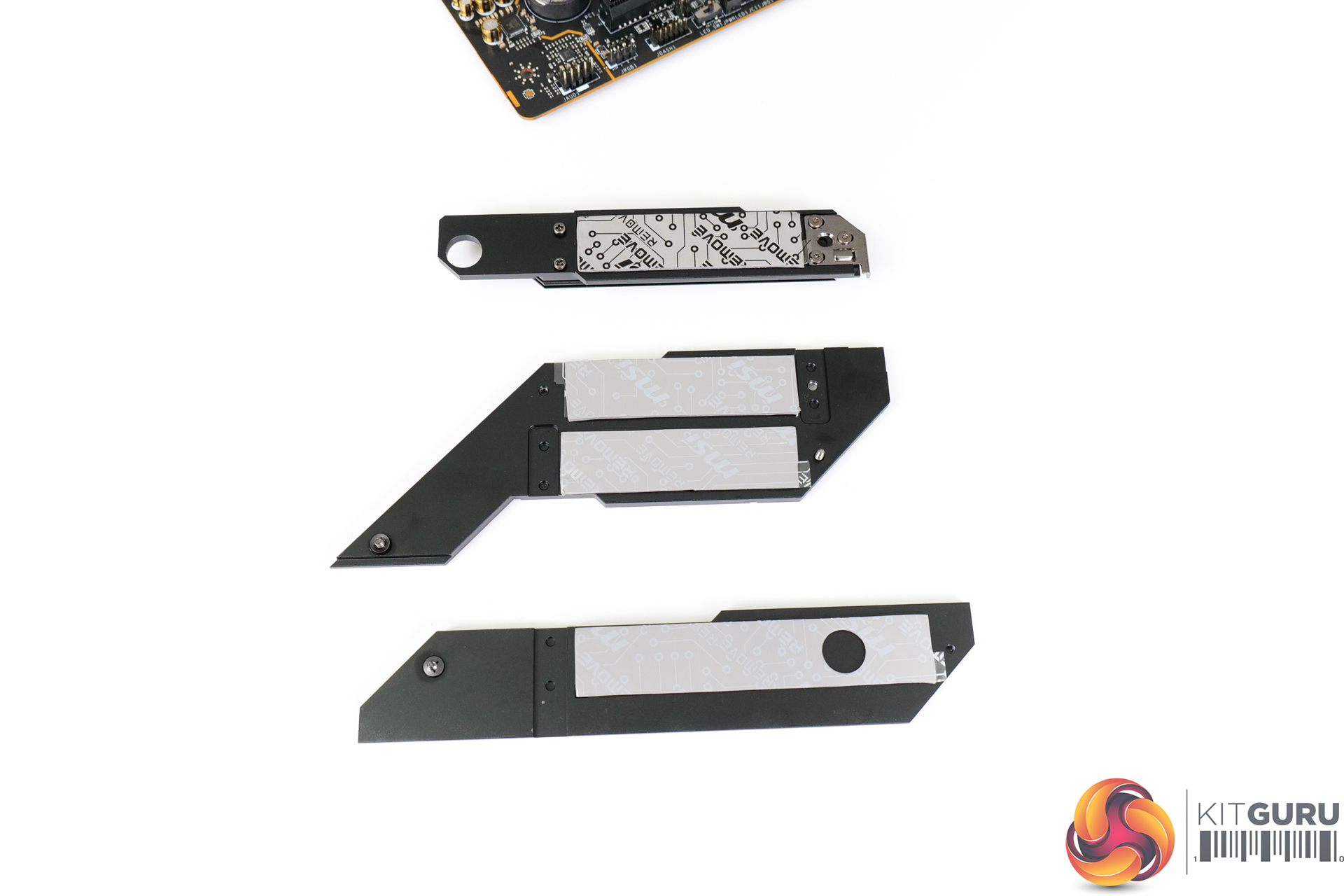 You get an individual strip cooler for the uppermost M.2 SSD slot with thermal pads on both sides. I like this design because it is tool-less through-and-through. As is now common, the SSD can be secured via a tool-less latch. But the heatsink can also be removed by pushing a mechanism to free and pop it out of place.