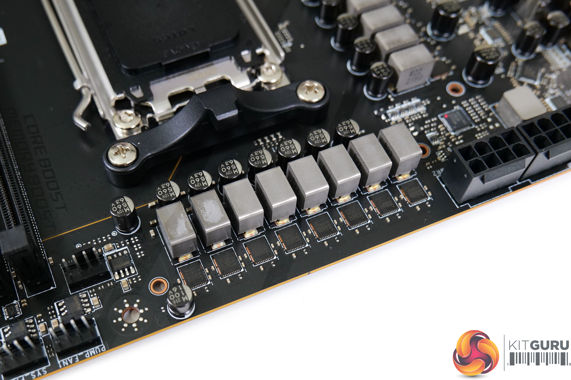 The primary power delivery system is built around a 16+2+1 stage power delivery solution with Monolithic Power Systems hardware. This uses an MPS2123 / MP2857 PWM controller and there are MPS 2206 / MP87670 DrMOS power stages that are 80A rated.