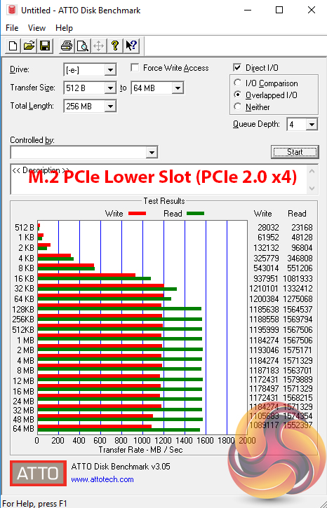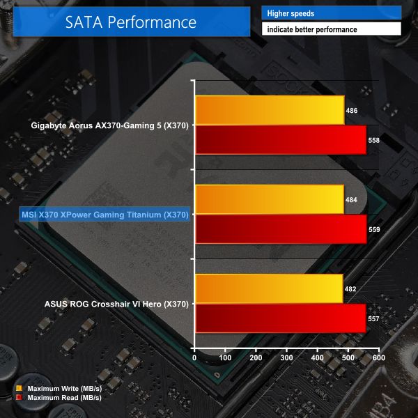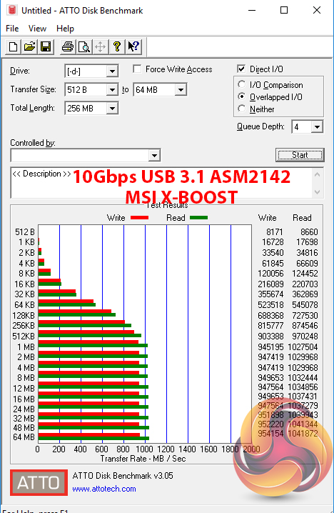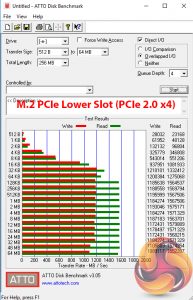 M.2 PCIe performance was slightly faster on MSI's board than on the competitors. The write speed is improved by a small amount over the competitors and this result is repeatable. MSI's M.2 Shield may be having an influence here, as it managed to keep our Toshiba OCZ RD400 SSD at a maximum of 69°C during the ATTO test, which is a few degrees cooler than on ASUS and Gigabyte competitors (and beyond margin of error).