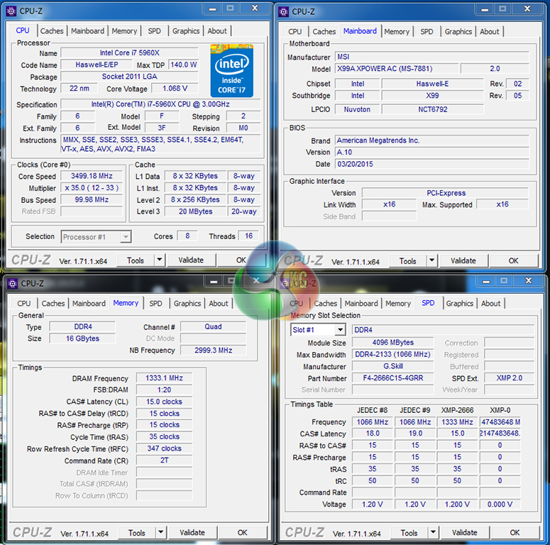 - Asus TUF Sabertooth X99 (BIOS v0216) – with 16GB (4x 4GB) G.Skill Ripjaws4 2666MHz CL15 DDR4 @ 1.20V.