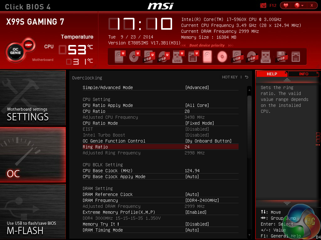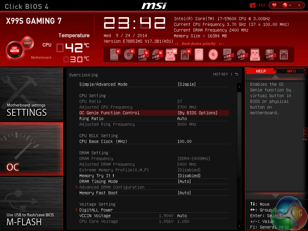 With a push (or click in the software method) of the OC Genie button, MSI's X99S Gaming 7 is presented with a 3.7GHz CPU frequency and 2400MHz memory speed. Cache frequency is maintained at the typical stock level of 3.0GHz.