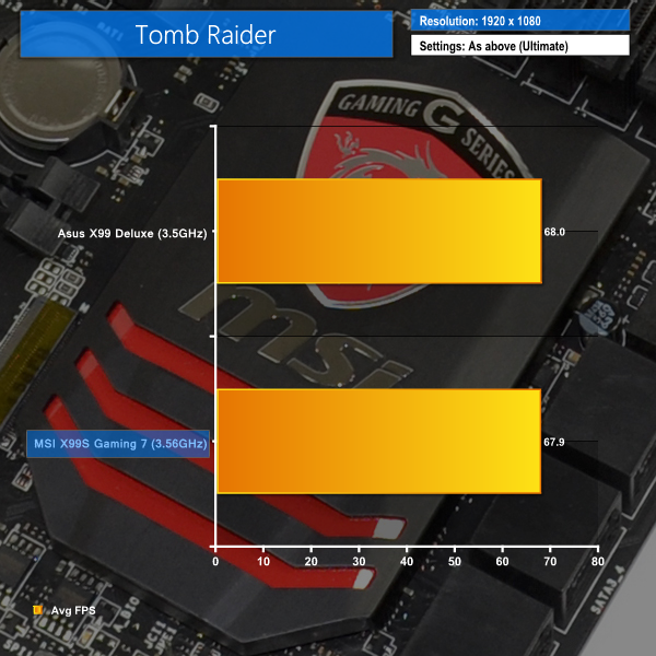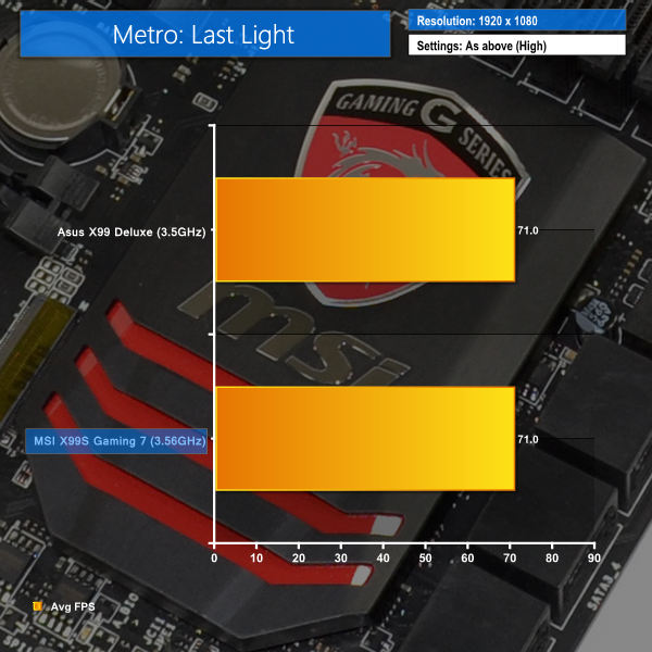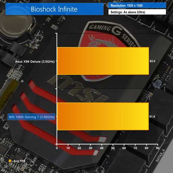 MSI's X99S Gaming 7 offers solid gaming performance. The biggest frame rate difference between itself and the Asus X99 Deluxe is a minor 0.2 of a frame in Bioshock Infinite.