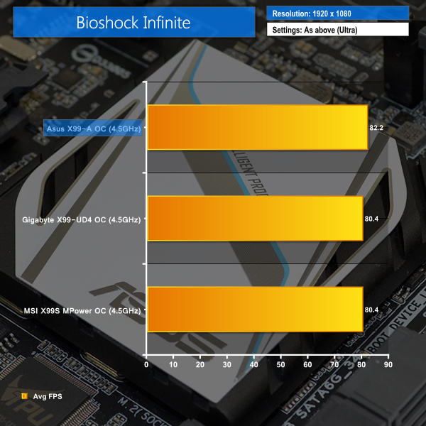 Performance in Bioshock Infinite takes a notable drop from the stock-clocked result of 82.3 FPS. We have noticed deteriorating game performance (albeit very small in most occasions) when overclocking X99-based systems on a few occasions. The differential could be related to PCIe link clocks between the CPU and graphics card.