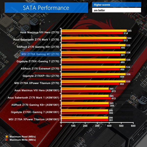 SATA 6Gbps performance from MSI's Z170A Gaming M7 is not going to bottleneck a relevant SSD. There is no cause for concern with the board's result.