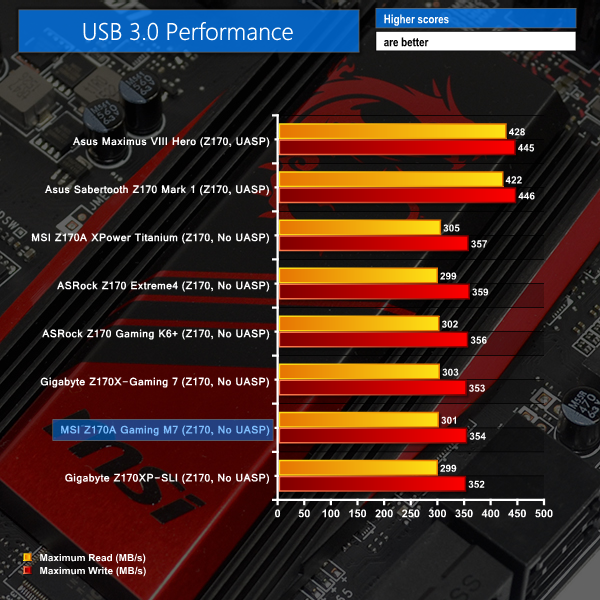 USB 3.0 performance from the board is about as fast as it gets without a UASP-activating piece of software for our Windows 7 test system. Asus' boards still rule the speed scene for Windows 7 users thanks to the vendor's supplementary UASP-activating software tool.