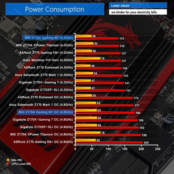 Idle power consumption from MSI's Z170A Gaming M7 is good thanks to the speed at which the Intersil PWM controller drops CPU voltage under lower loads. MSI's sensible MCT CPU voltage level of around 1.2V also benefits the board's load power consumption with the CPU at 4.2GHz.
