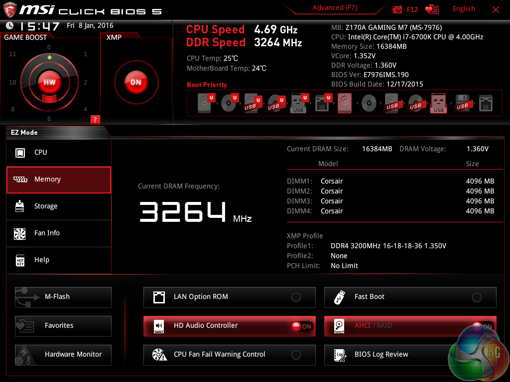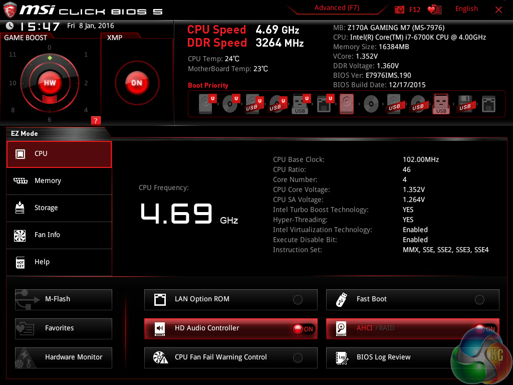 It seems that MSI has applied the ‘manually compensate for it' logic for their overclocking presets; the Z170A Gaming M7 sees a UEFI-set 1.352V for the 4.69GHz preset, whereas the Z170A XPower Gaming Titanium Edition set 1.315V for the exact same frequency preset.