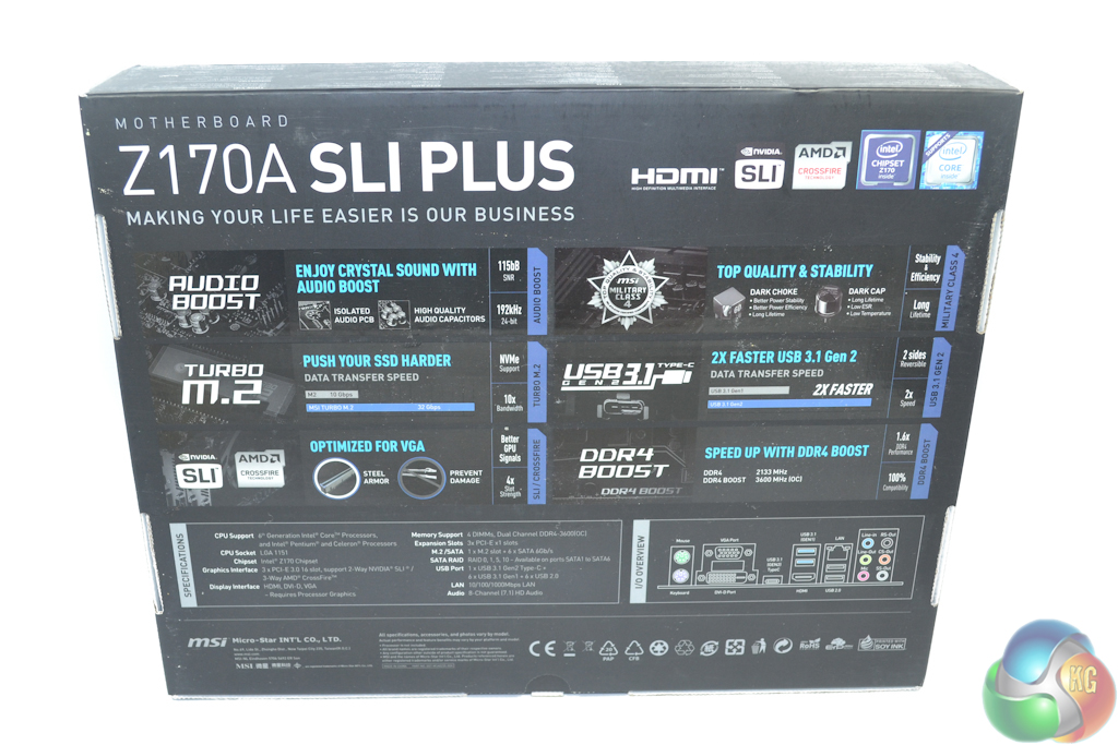 MSI ships the Z170A SLI Plus in a plain black box which features naming on the front and detailed information to the rear.