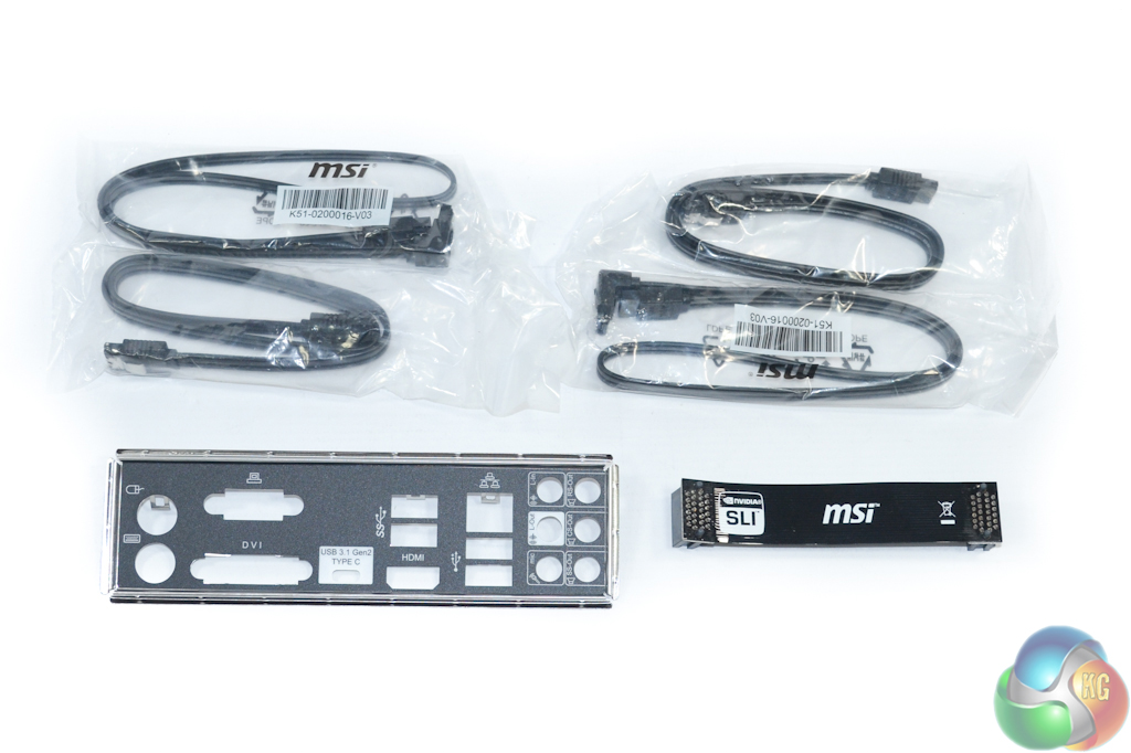 A decent bundle is formed of four SATA cables, a flexible black SLI ribbon, and the labelled rear IO shield.