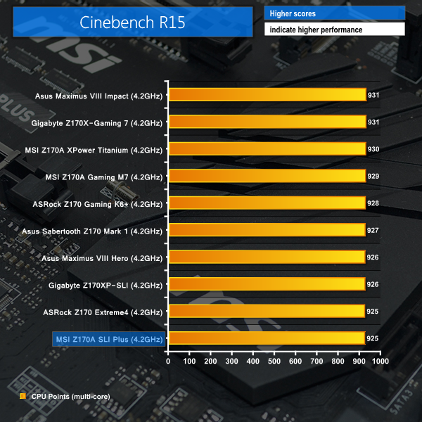 Performance groupings are very tight in our trio of CPU-heavy benchmarks. MSI's Z170A SLI Plus sits in joint-bottom position in Cinebench, likely due to its minor CPU Cache frequency reduction versus many competing boards.