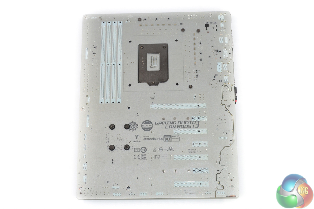 Taking a look at the board's rear side allows the PCB colour to be characterised more effectively. The metallic-looking coating seems to be applied over a white PCB layer positioned underneath. Cut-outs near many connectors provide this indication.