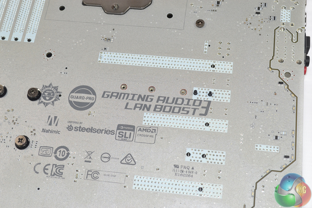 The heatsinks are noticeably more shiny and feature a finish that resembles powder coating, with the appearance of fine metallic particles being present. There is no rear IO port cover that we have seen utilised on many other gaming motherboards. Overclocking users told MSI that IO covers simply get in the way when pushing the board with extreme cooling hardware so the company decided against providing one.