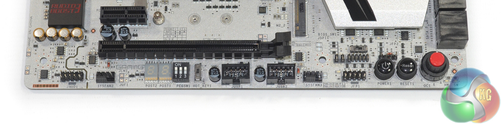 The two-digit POST LEDs display temperature when the system is running in an OS. Next to the display is the switch box that allows PCIe slots one, two, and three to be disabled for troubleshooting measures. Moving to the right side sees onboard power, reset, and auto OC dial deployed.