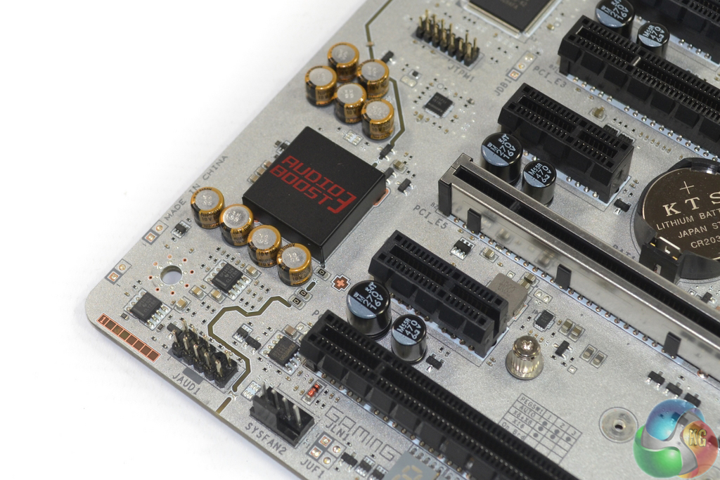 Two 10Gbps USB 3.1 Type-A ports (between the LAN and audio jacks) are provided by an ASMedia ASM1142 host chipset. There's no USB 3.1 Type-C connector as that would require additional cost (in the form of an EtronTech EJ179V switch IC) and is deemed irrelevant for an overclocking-geared board. The up-and-coming connection will be sorely missed by many general buyers, even if its 100W power delivery specification was not implemented (as it is not on most motherboards).